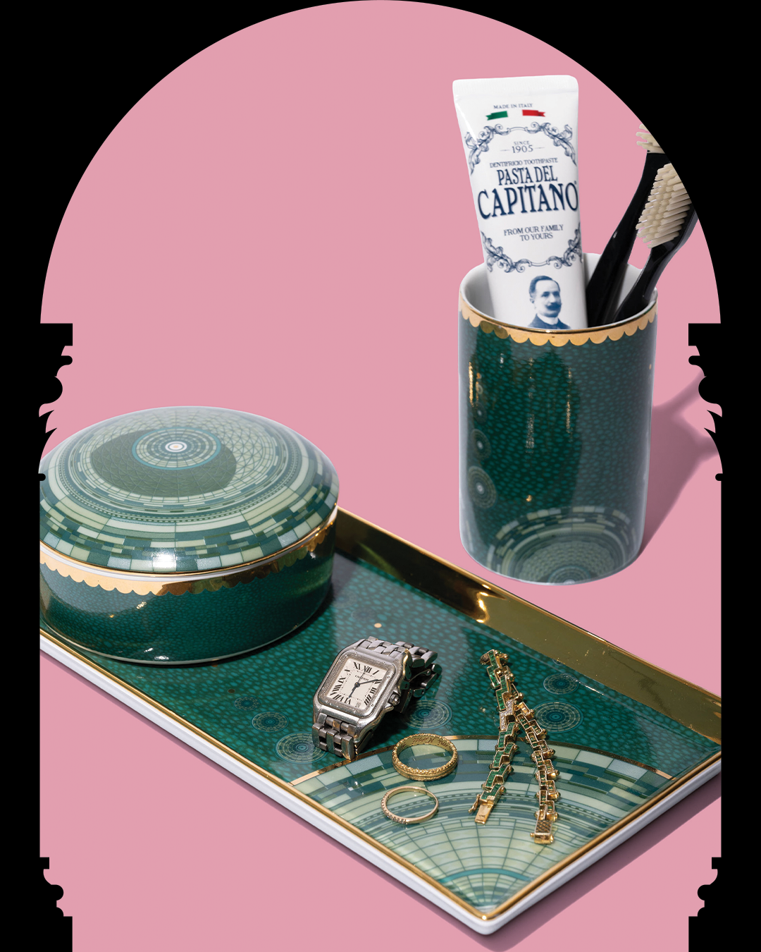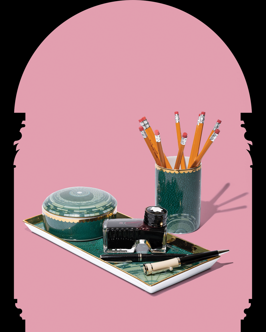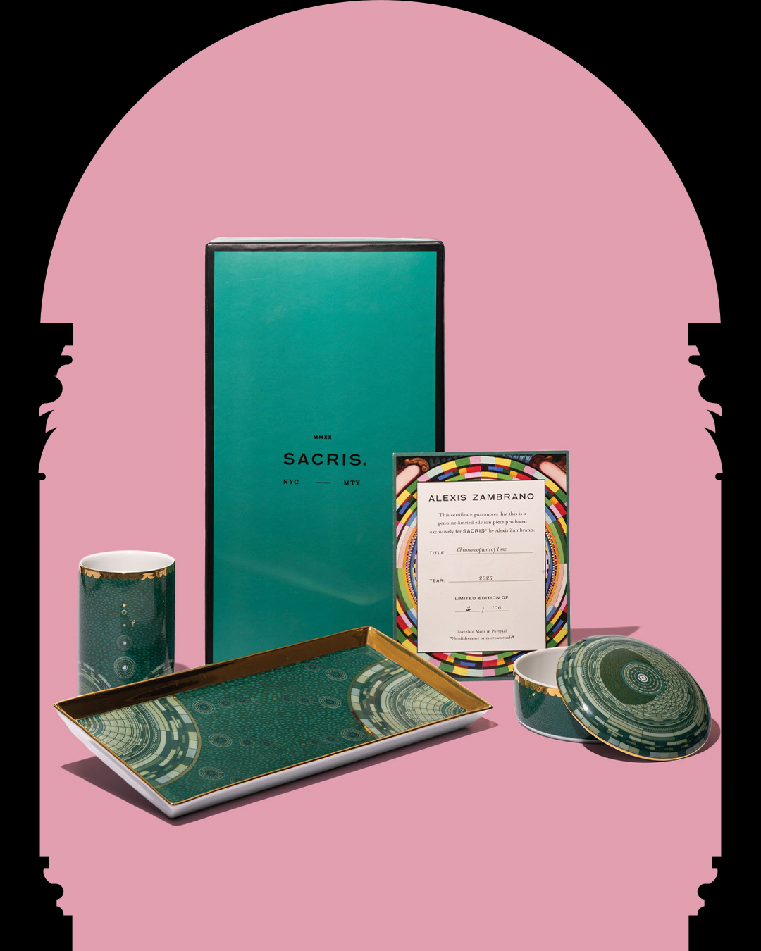 Limited edition porcelain desk/vanity set made in Portugal exclusively for Sacris® by Alexis Zambrano. Includes 1 tray, 1 vanity box, 1 cup and certificate of authenticity. Limited edition of 100.