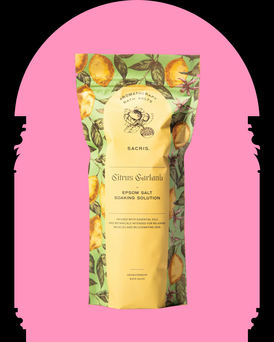 Epsom salt soaking solution infused with essential oils and botanicals intended for relaxing muscles and rejuvenating skin, 400g. Fresh citrus scent with notes of lemongrass, juniper berry, lavender & bergamot.