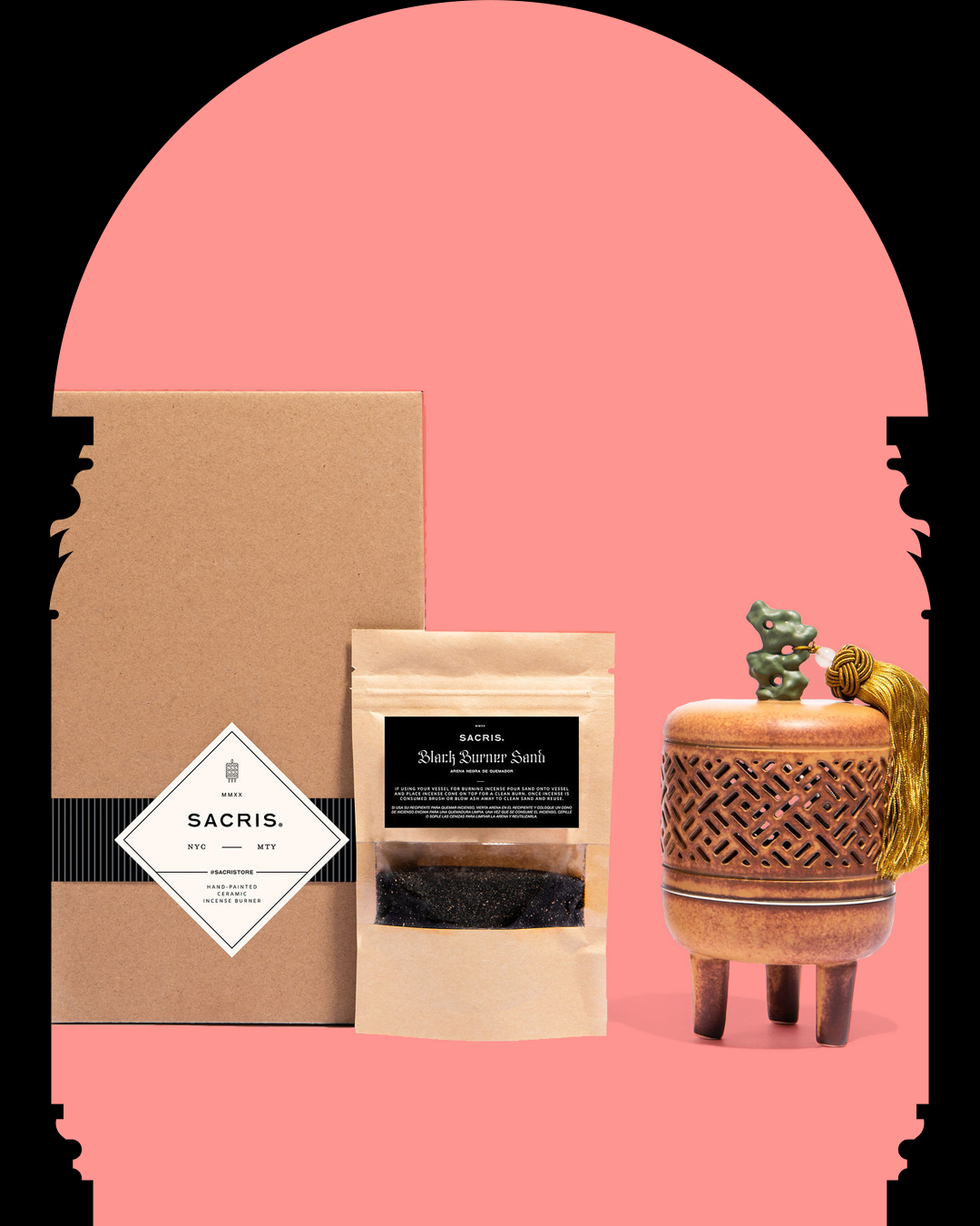 Hand painted, ceramic incense burner. Includes 1 bag of black burner sand.